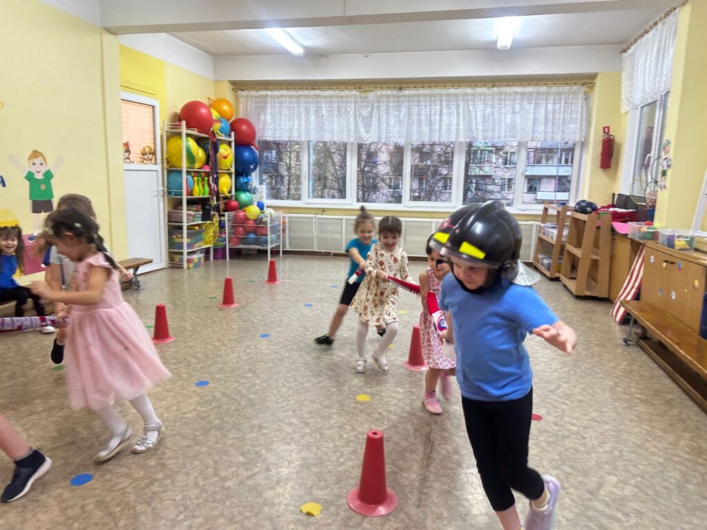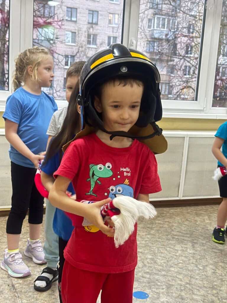 После беседы ребята превратились в бравых пожарных. Разделившись на две команды, ребята прибыли к месту пожара, спасли пострадавших из огня и потушили пожар.