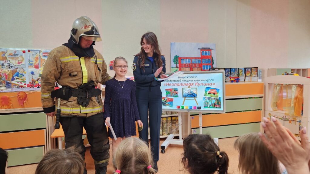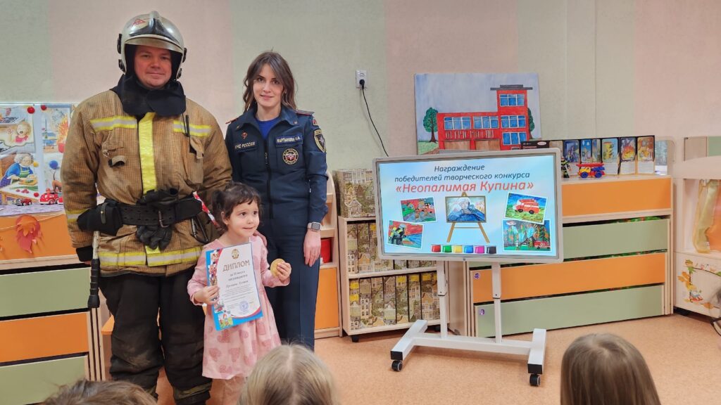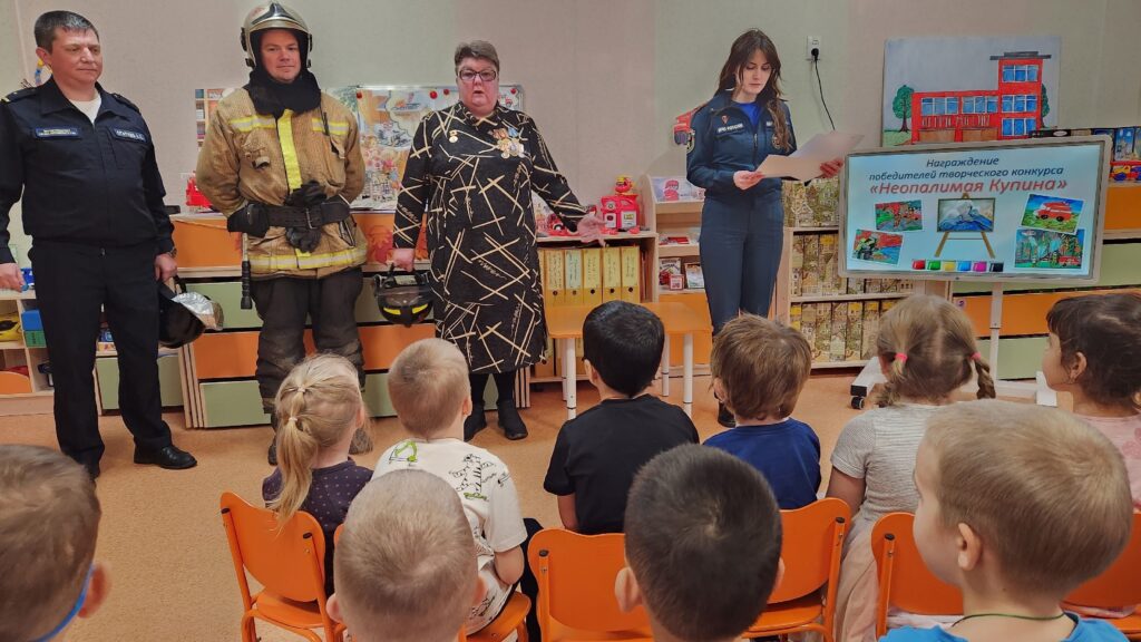 В Колпинском районе продолжается акция «Безопасный Новый год». Работники местного отделения ВДПО и пожарно-спасательным отрядом совместно с сотрудниками отдела надзорной деятельности управления МЧС Колпинского района приходят к воспитанникам дошкольных образовательных учреждений для проведения бесед о соблюдении правил пожарной безопасности в новогодние каникулы. Ребята с огромным удовольствием слушают рассказы настоящего пожарного, примеряют пожарную экипировку. Но самый важный момент мероприятия – награждение победителей и призёров районных конкурсов «Огонь без_опасности» и «Неопалимая Купина». Гости благодарят ребят за отличное выступление в районе и награждают грамотами. А медали победителям вручает настоящий пожарный — представитель 48 пожарно-спасательной части Бородулин Ю. Г.